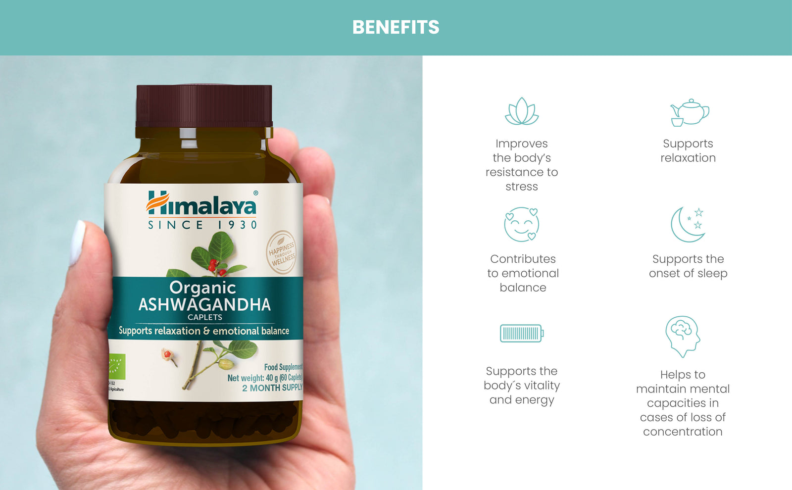 استُخدمت الأشواغاندا لقرونٍ طويلة للتخفيف من التوتر وزيادة الطاقة، وهي معروفة بخصائصها المُكيّفة. يُعدّ مُنتج هيمالايا العضوي من الأشواغاندا مزيجًا من مسحوق جذور الأشواغاندا ومستخلصها، يدعم مقاومة الجسم للتوتر، ويُساعد على الاسترخاء، ويُحقق التوازن العاطفي.